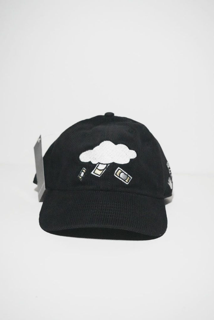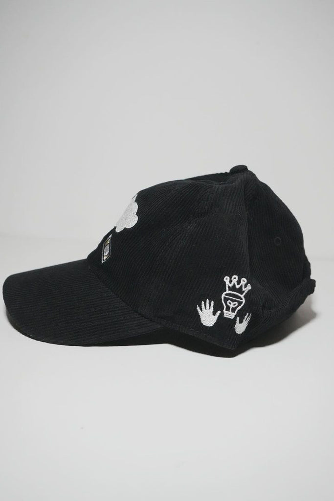 Black corduroy dad hat with embroidered money cloud on front and AIP symbol on left side.