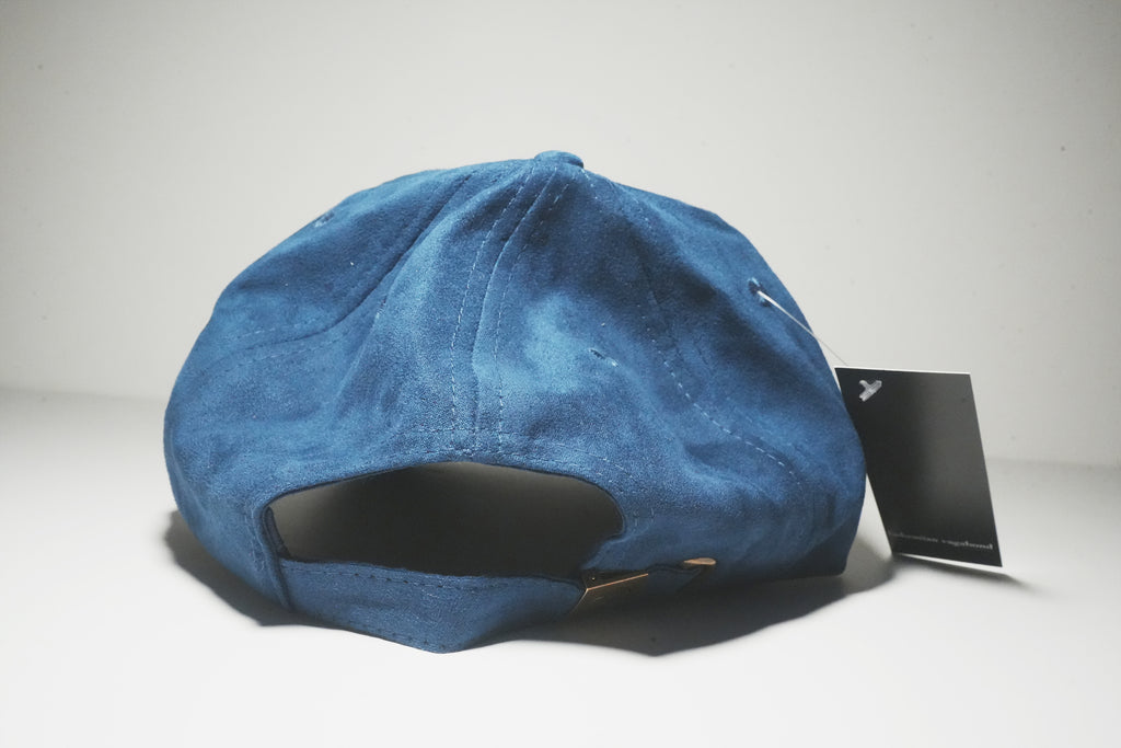 Blue suede dad hat with money cloud symbol embroidered on front and AIP symbol embroidered on left side.